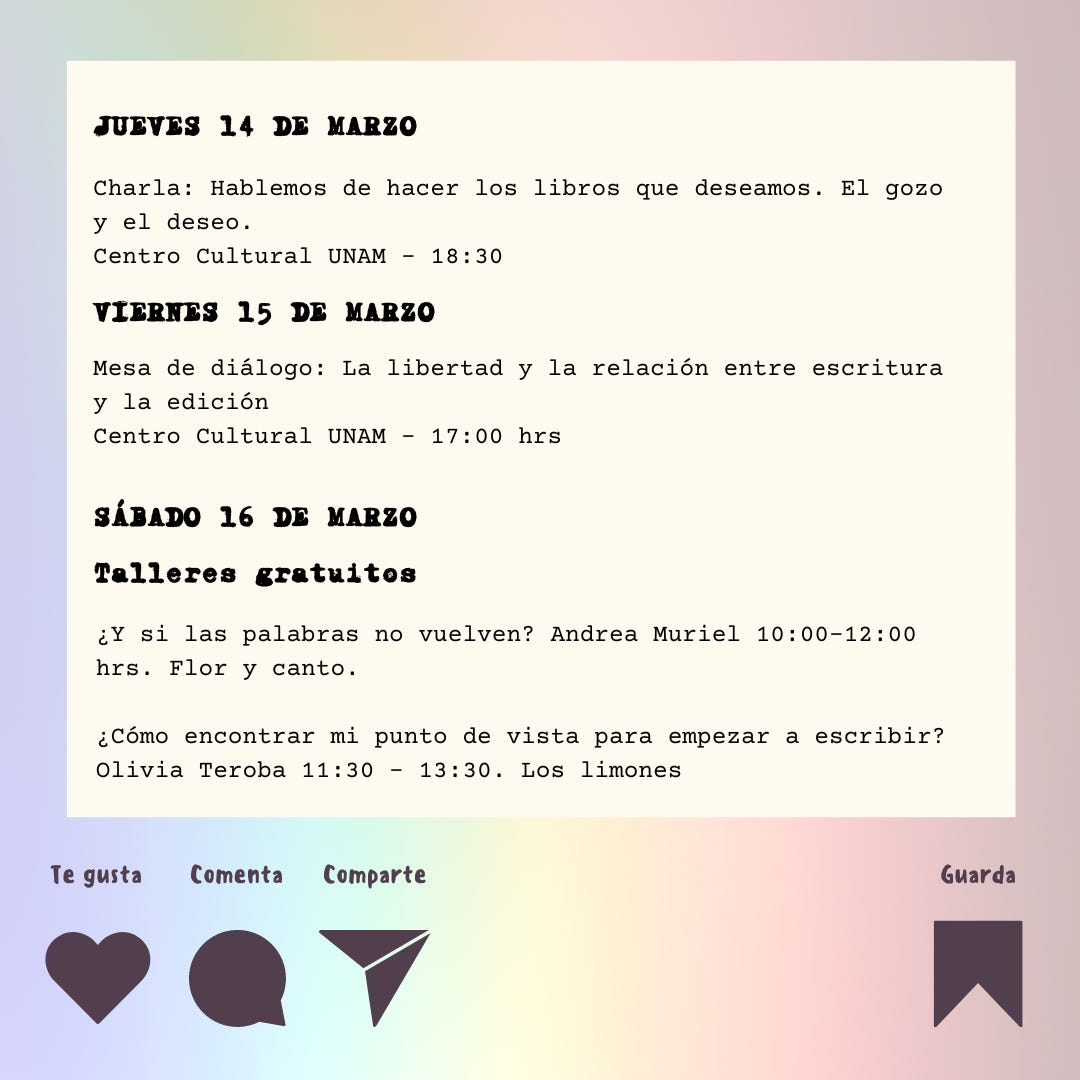 Al día siguiente, jueves 14 de marzo, Andrea Muriel, también integrante de Osa Menor, y yo, viajaremos a Morelia para el V Encuentro El Traspatio, lo que sucede detrás del libro, donde nos reuniremos con colegas editores para hablar de nuestra trayectoria, procesos y publicaciones. Acá puedes ver el programa completo, hay actividades buenísimas, todas muy recomendadas. Y acá puedes registrarte para cualquiera de los talleres.