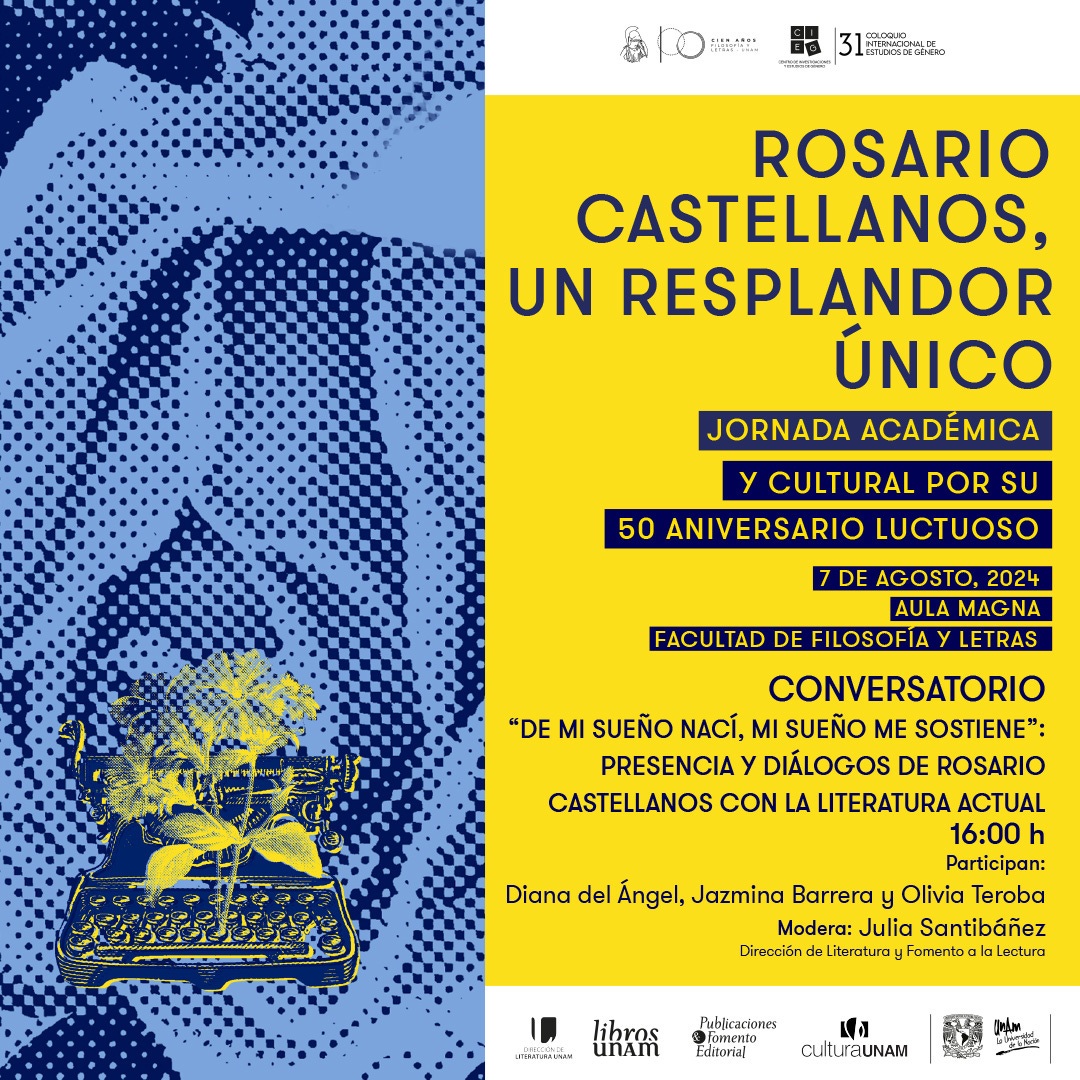 Agosto se viene con todo, y una de las actividades que más me emociona es la Jornada Académica y Cultural por el 50 aniversario luctuso de Rosario Castellanos que se llevará a cabo en la Facultad de Filosofía y Letras en la UNAM. Pueden ver el programa completo en este enlace. Yo participaré en un conversatorio, les dejo los datos a continuación: