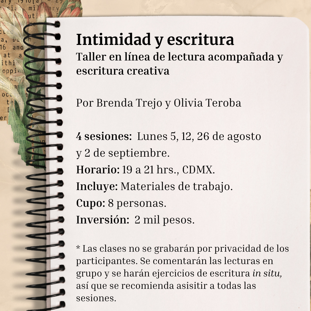 Hablando de terapias: daré un taller online sobre diarios íntimos con Brenda Trejo, amiga mía, escritora y maestra en psicología clínica. A ella la conocí hace ocho años en la Fundación para las Letras Mexicanas. Desde ese entonces, Brenda investiga teoría sobre intimidad, autobiografía y diarios. La idea del taller es leer una selección de estas lecturas y comentarla durante la primera mitad de la sesión. La segunda mitad, haremos ejercicios in situ donde desarrollaremos herramientas de escritura creativa a partir de las nociones de intimidad y escritura diarística. Estas herramientas pueden ser de utilidad tanto si te interesa escribir ficción como no ficción. De cualquier modo, no es necesario tener ninguna experiencia previa, solo entusiasmo por trabajar en grupo, leer y escribir.